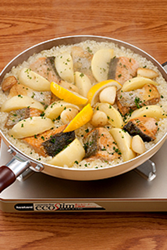 - 鮭魚除骨切成3段,加適量鹽和醬油腌制(分量外)。土豆去皮,縱切6片浸泡水中,再撈至篩子上去水分。洋蔥切碎,大蒜剝皮備用,往湯內(nèi)加入海鮮素?cái)嚾趥溆?/li>