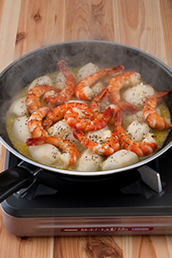 • 芋頭去皮,切成兩塊,撒上少許鹽(分量外)攪拌均勻,洗掉后瀝干水分,蝦剝殼且留蝦尾巴,大蒜粗切成小丁。